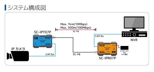 SC-IPC07Pは1チャンネル電源重畳EoC(Ethwenet over Coax)伝送装置で
